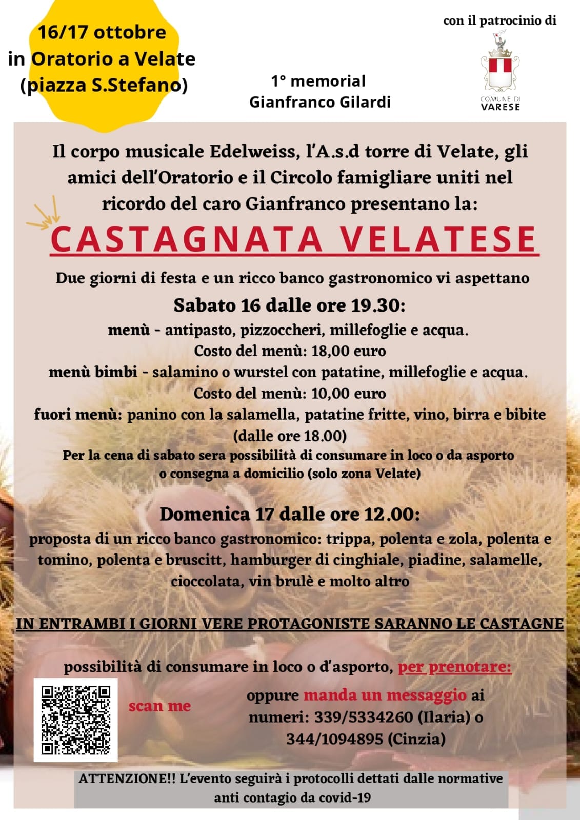 Il Corpo musicale Edelweiss, l'A.s.d torre di Velate, gli Amici dell'Oratorio insieme al Circlo familiare vi invitano a partecipare alla Castagnata Velatese!