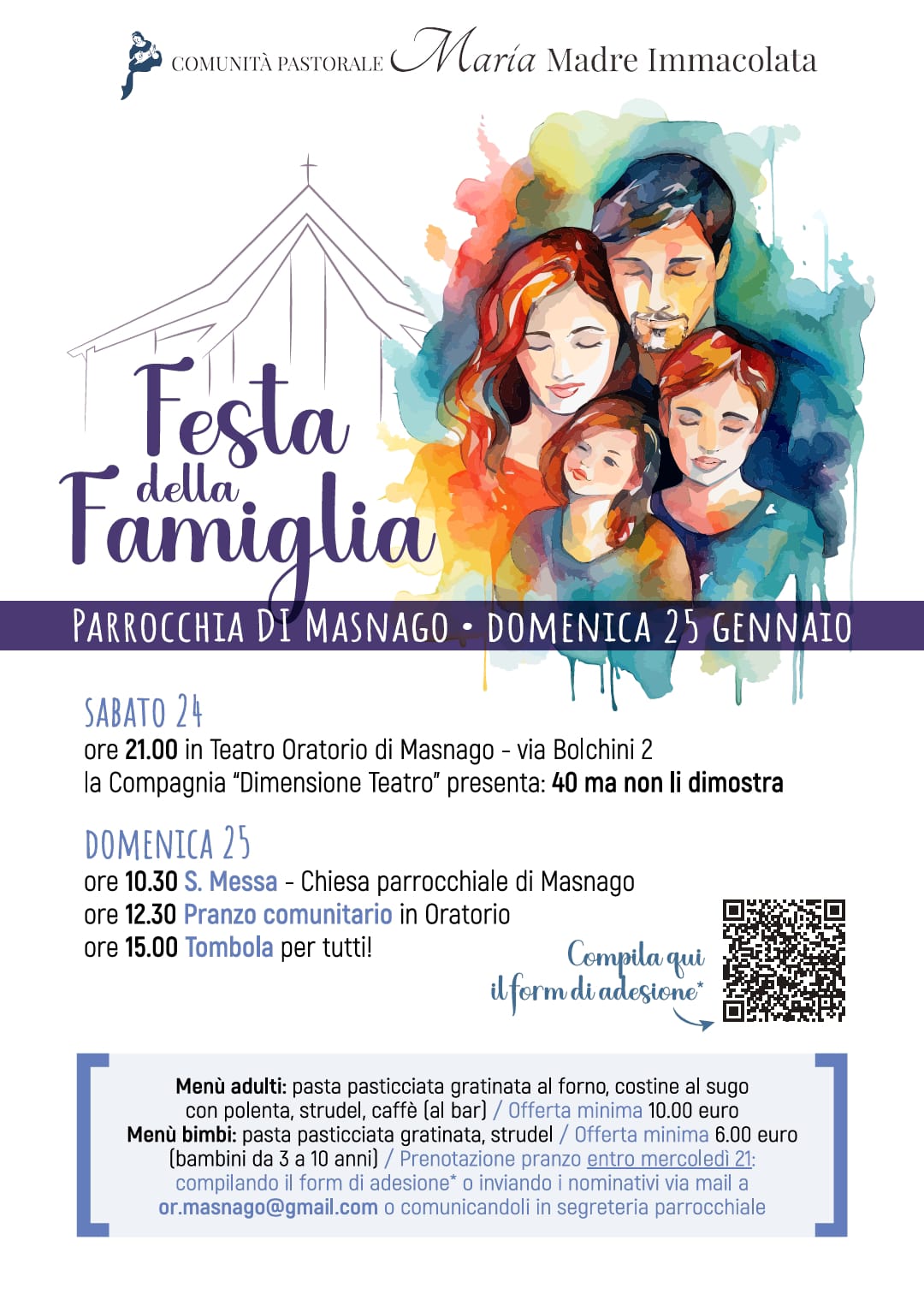 siamo felici di invitarvi alla Festa della Famiglia, che si terrà domenica 25 Gennaio nelle diverse parrocchie della nostra comunità pastorale. Sarà un’occasione speciale per celebrare insieme il dono della famiglia, condividendo momenti di gioia, preghiera e comunità.