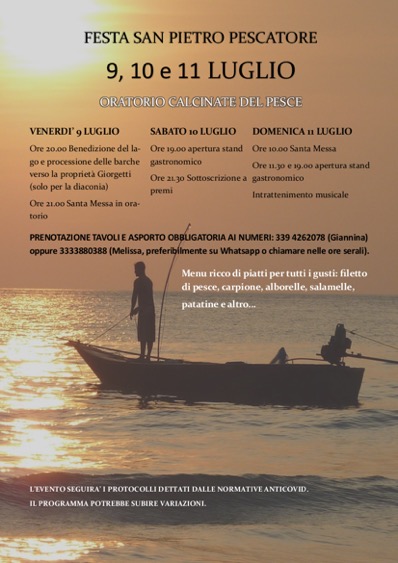 Quest'anno, per esigenze del calendario pastorale, la benedizione del lago si terrà il VENERDI' 9 LUGLIO e sarà seguita dalla consueta celebrazione della S. Messa. La sera di Sabato 10 e domenica 11 si terrà la consueta Sagra del pesce nel rispetto delle vigenti norme anticovid.